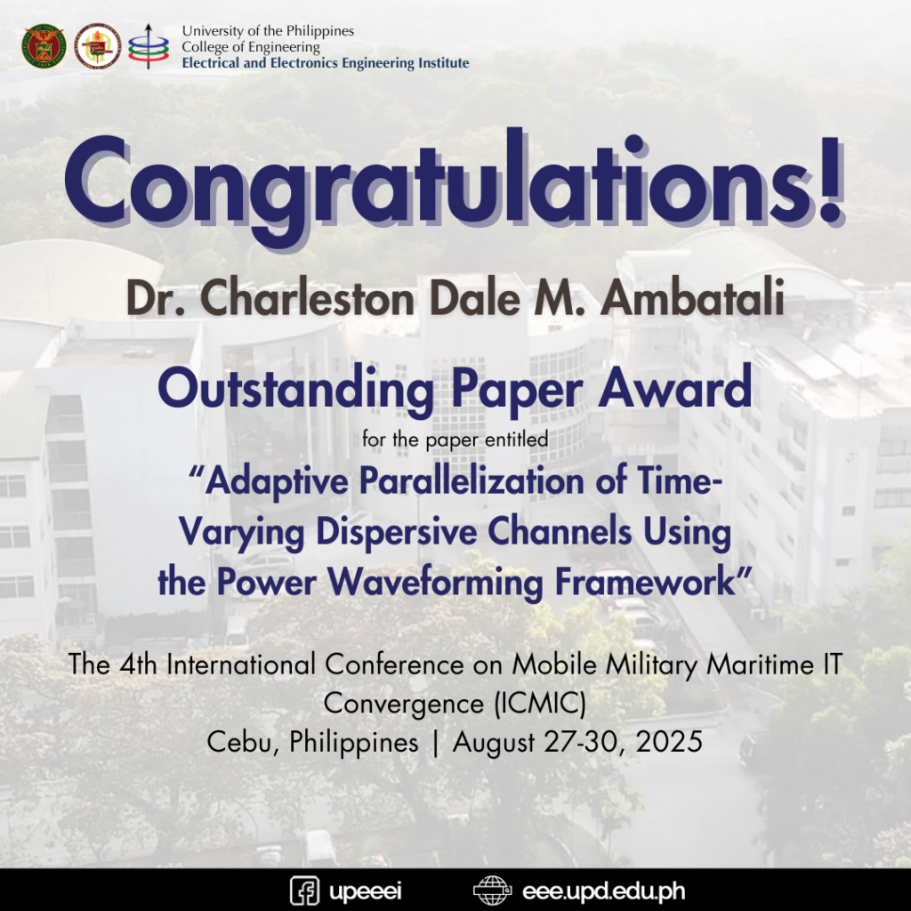 The Institute would like to congratulate its very own, Dr. Charleston Dale M. Ambatali, on being the recipient of the Outstanding Paper Award for his paper entitled “Adaptive Parallelization of Time-Varying Dispersive Channels Using the Power Waveforming Framework,” during the 4th International Conference on Mobile Military Maritime IT Convergence (ICMIC) in Cebu, Philippines.